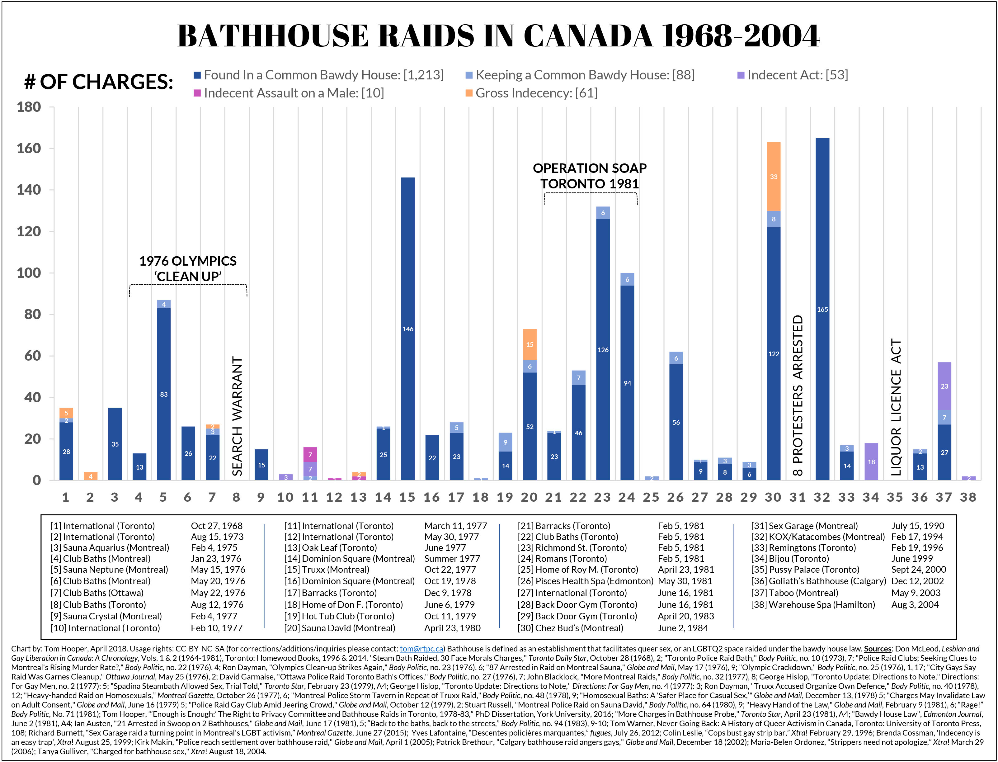 I developed this chart during the campaigns over bills C-66 and C-75. The purpose of the chart was to show to lawmakers and the public that bawdy-house offenses against queer communities were widespread.